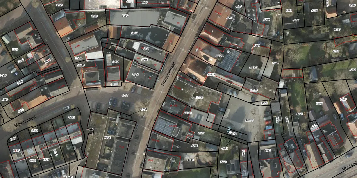 Het perceel waarop Prinsenstraat 16 staat heeft een oppervlakte van 505 m². Dit is een groot perceel. De perceeloppervlakte wordt geregistreerd door het Kadaster. Gedetailleerde informatie over de maten van dit perceel kunt u vinden in het rapport Kadastrale kaart met maatvoering van Prinsenstraat 16.