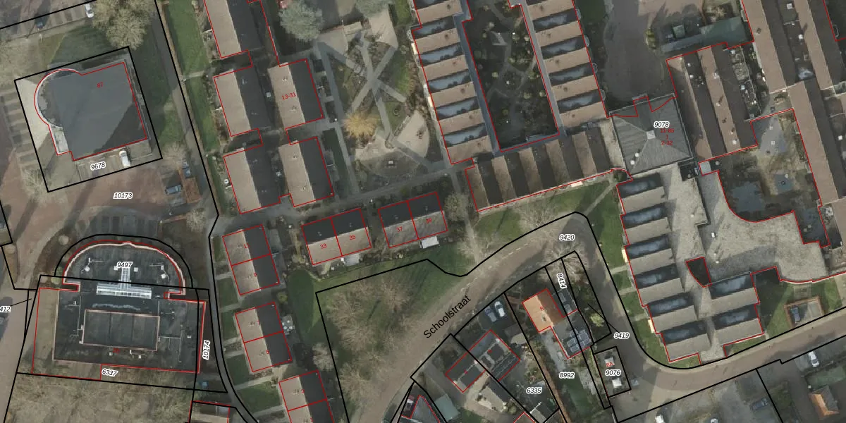 Het perceel waarop Schoolstraat 39 staat heeft een oppervlakte van 1,8 ha. Dit is een zeer groot perceel. De perceeloppervlakte wordt geregistreerd door het Kadaster. Gedetailleerde informatie over de maten van dit perceel kunt u vinden in het rapport Kadastrale kaart met maatvoering van Schoolstraat 39.