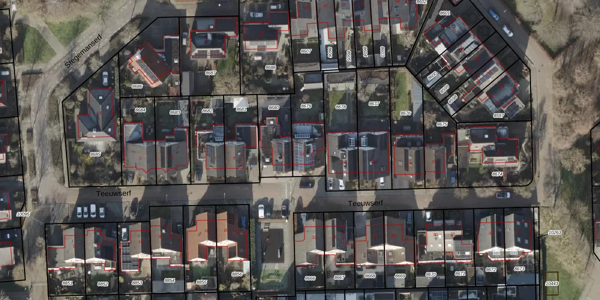 Het perceel waarop Teeuwserf 13 staat heeft een oppervlakte van 374 m². Dit is een groot perceel. De perceeloppervlakte wordt geregistreerd door het Kadaster. Gedetailleerde informatie over de maten van dit perceel kunt u vinden in het rapport Kadastrale kaart met maatvoering van Teeuwserf 13.
