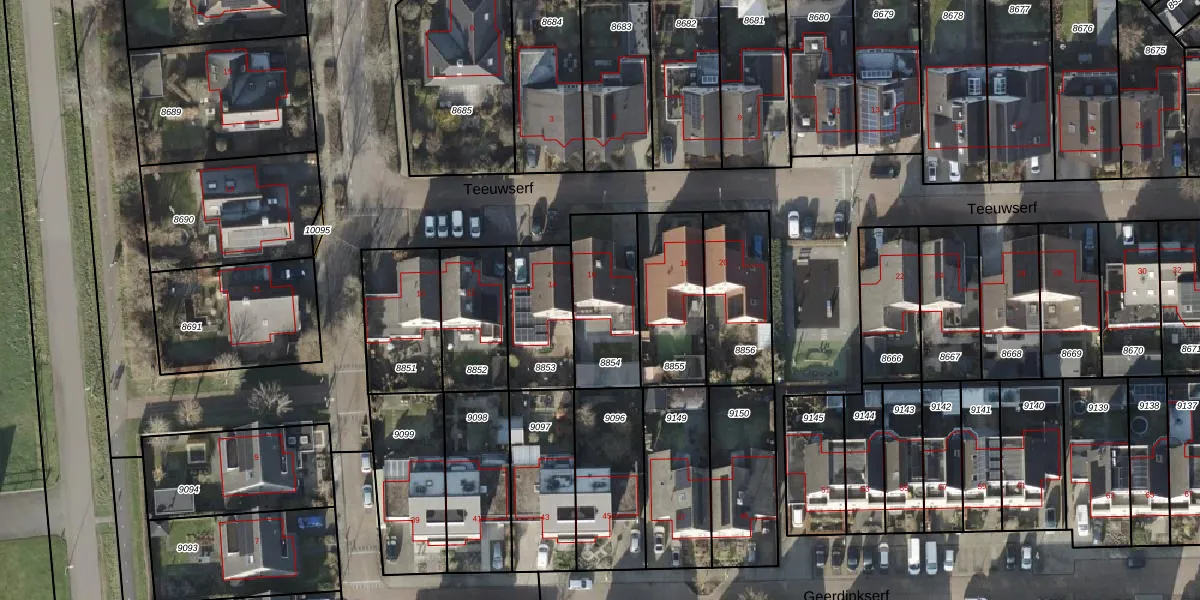 Het perceel waarop Teeuwserf 16 staat heeft een oppervlakte van 322 m². Dit is een groot perceel. De perceeloppervlakte wordt geregistreerd door het Kadaster. Gedetailleerde informatie over de maten van dit perceel kunt u vinden in het rapport Kadastrale kaart met maatvoering van Teeuwserf 16.