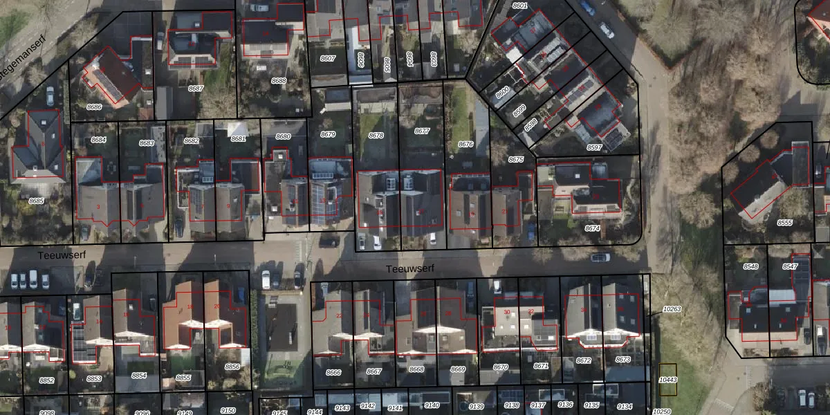 Het perceel waarop Teeuwserf 17 staat heeft een oppervlakte van 448 m². Dit is een groot perceel. De perceeloppervlakte wordt geregistreerd door het Kadaster. Gedetailleerde informatie over de maten van dit perceel kunt u vinden in het rapport Kadastrale kaart met maatvoering van Teeuwserf 17.