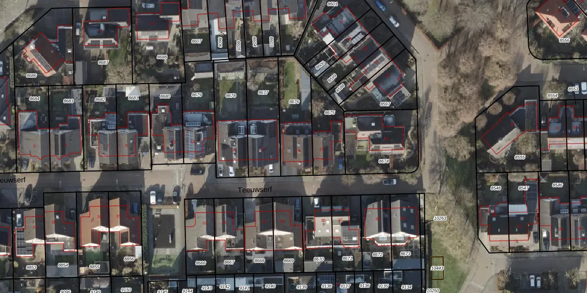 Het perceel waarop Teeuwserf 19 staat heeft een oppervlakte van 433 m². Dit is een groot perceel. De perceeloppervlakte wordt geregistreerd door het Kadaster. Gedetailleerde informatie over de maten van dit perceel kunt u vinden in het rapport Kadastrale kaart met maatvoering van Teeuwserf 19.