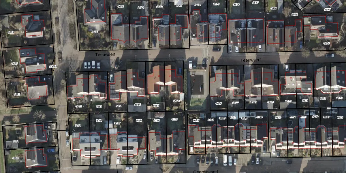 Het perceel waarop Teeuwserf 20 staat heeft een oppervlakte van 322 m². Dit is een groot perceel. De perceeloppervlakte wordt geregistreerd door het Kadaster. Gedetailleerde informatie over de maten van dit perceel kunt u vinden in het rapport Kadastrale kaart met maatvoering van Teeuwserf 20.