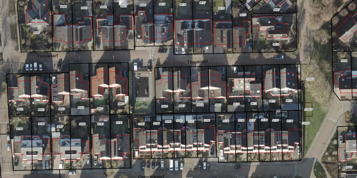 Het perceel waarop Teeuwserf 24 staat heeft een oppervlakte van 259 m². Dit is een middelgroot perceel. De perceeloppervlakte wordt geregistreerd door het Kadaster. Gedetailleerde informatie over de maten van dit perceel kunt u vinden in het rapport Kadastrale kaart met maatvoering van Teeuwserf 24.