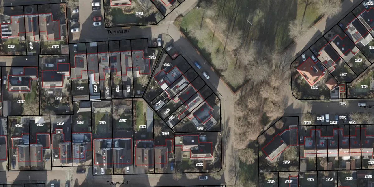 Het perceel waarop Teeuwserf 33 staat heeft een oppervlakte van 182 m². Dit is een middelgroot perceel. De perceeloppervlakte wordt geregistreerd door het Kadaster. Gedetailleerde informatie over de maten van dit perceel kunt u vinden in het rapport Kadastrale kaart met maatvoering van Teeuwserf 33.