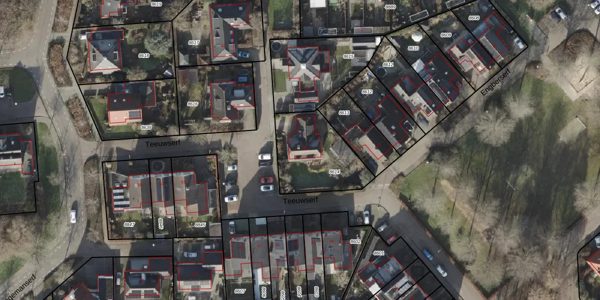 Het perceel waarop Teeuwserf 38 staat heeft een oppervlakte van 658 m². Dit is een groot perceel. De perceeloppervlakte wordt geregistreerd door het Kadaster. Gedetailleerde informatie over de maten van dit perceel kunt u vinden in het rapport Kadastrale kaart met maatvoering van Teeuwserf 38.
