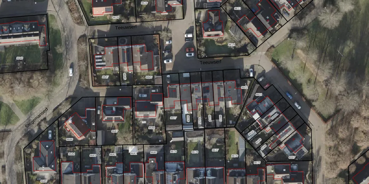 Het perceel waarop Teeuwserf 47 staat heeft een oppervlakte van 185 m². Dit is een middelgroot perceel. De perceeloppervlakte wordt geregistreerd door het Kadaster. Gedetailleerde informatie over de maten van dit perceel kunt u vinden in het rapport Kadastrale kaart met maatvoering van Teeuwserf 47.