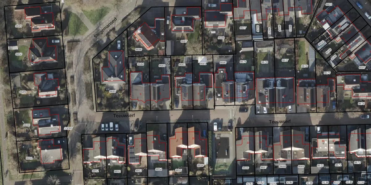 Het perceel waarop Teeuwserf 7 staat heeft een oppervlakte van 338 m². Dit is een groot perceel. De perceeloppervlakte wordt geregistreerd door het Kadaster. Gedetailleerde informatie over de maten van dit perceel kunt u vinden in het rapport Kadastrale kaart met maatvoering van Teeuwserf 7.
