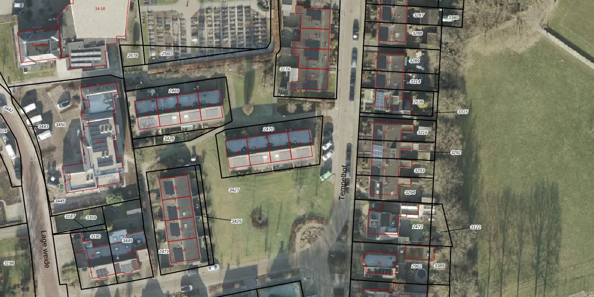 Het perceel waarop Tempelhof 12 staat heeft een oppervlakte van 561 m². Dit is een groot perceel. De perceeloppervlakte wordt geregistreerd door het Kadaster. Gedetailleerde informatie over de maten van dit perceel kunt u vinden in het rapport Kadastrale kaart met maatvoering van Tempelhof 12.