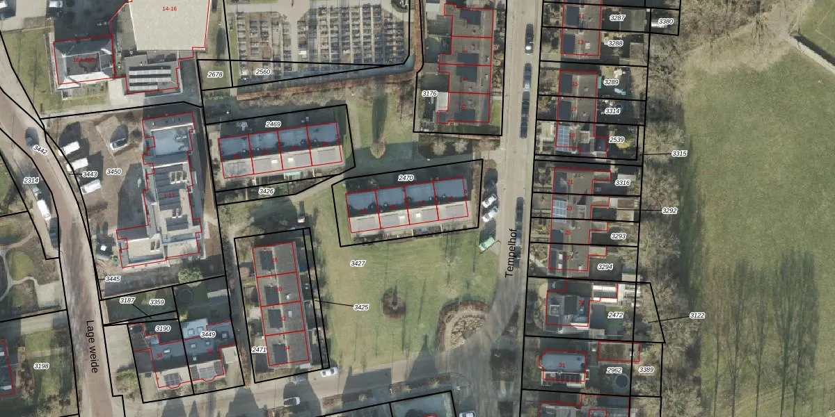 Het perceel waarop Tempelhof 14 staat heeft een oppervlakte van 561 m². Dit is een groot perceel. De perceeloppervlakte wordt geregistreerd door het Kadaster. Gedetailleerde informatie over de maten van dit perceel kunt u vinden in het rapport Kadastrale kaart met maatvoering van Tempelhof 14.