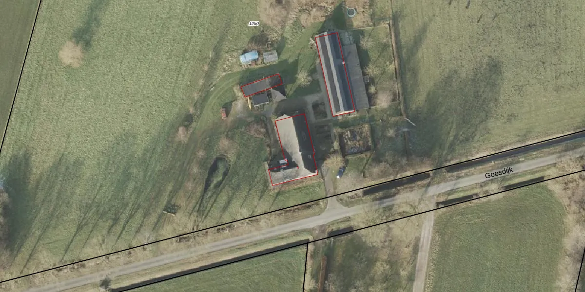 Het perceel waarop Goosdijk 4 staat heeft een oppervlakte van 2,1 ha. Dit is een zeer groot perceel. De perceeloppervlakte wordt geregistreerd door het Kadaster. Gedetailleerde informatie over de maten van dit perceel kunt u vinden in het rapport Kadastrale kaart met maatvoering van Goosdijk 4.