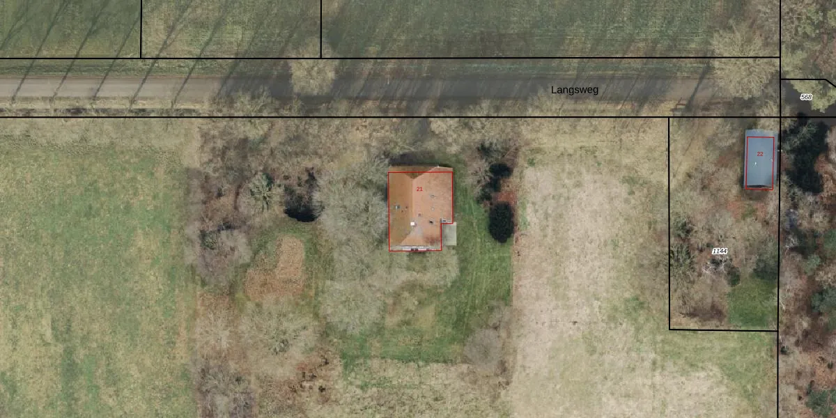Het perceel waarop Langsweg 21 staat heeft een oppervlakte van 3,5 ha. Dit is een zeer groot perceel. De perceeloppervlakte wordt geregistreerd door het Kadaster. Gedetailleerde informatie over de maten van dit perceel kunt u vinden in het rapport Kadastrale kaart met maatvoering van Langsweg 21.