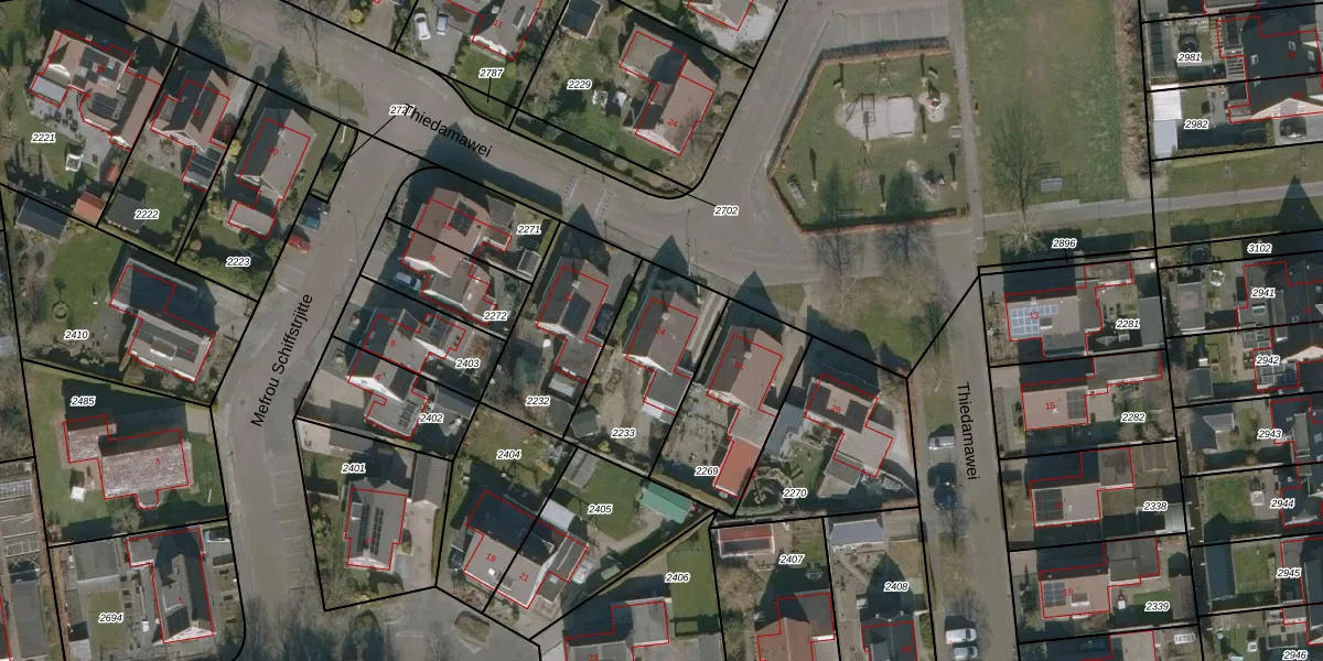 Het perceel waarop Thiedamawei 24 staat heeft een oppervlakte van 430 m². Dit is een groot perceel. De perceeloppervlakte wordt geregistreerd door het Kadaster. Gedetailleerde informatie over de maten van dit perceel kunt u vinden in het rapport Kadastrale kaart met maatvoering van Thiedamawei 24.