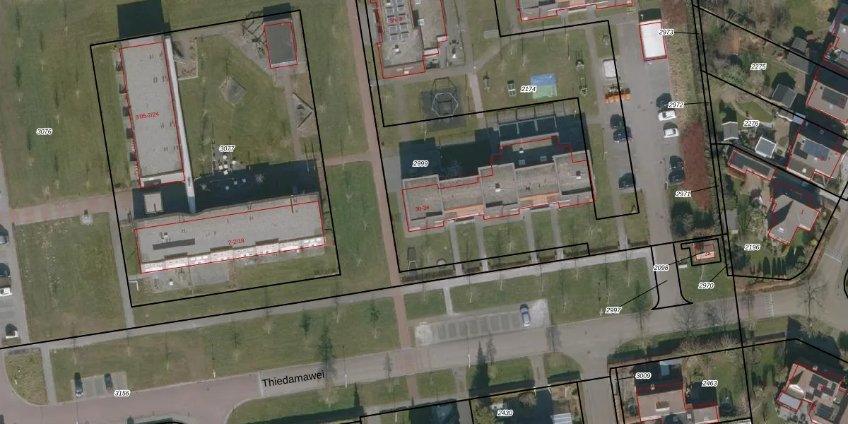 Het perceel waarop Thiedamawei 3-b staat heeft een oppervlakte van 4925 m². Dit is een zeer groot perceel. De perceeloppervlakte wordt geregistreerd door het Kadaster. Gedetailleerde informatie over de maten van dit perceel kunt u vinden in het rapport Kadastrale kaart met maatvoering van Thiedamawei 3-b.