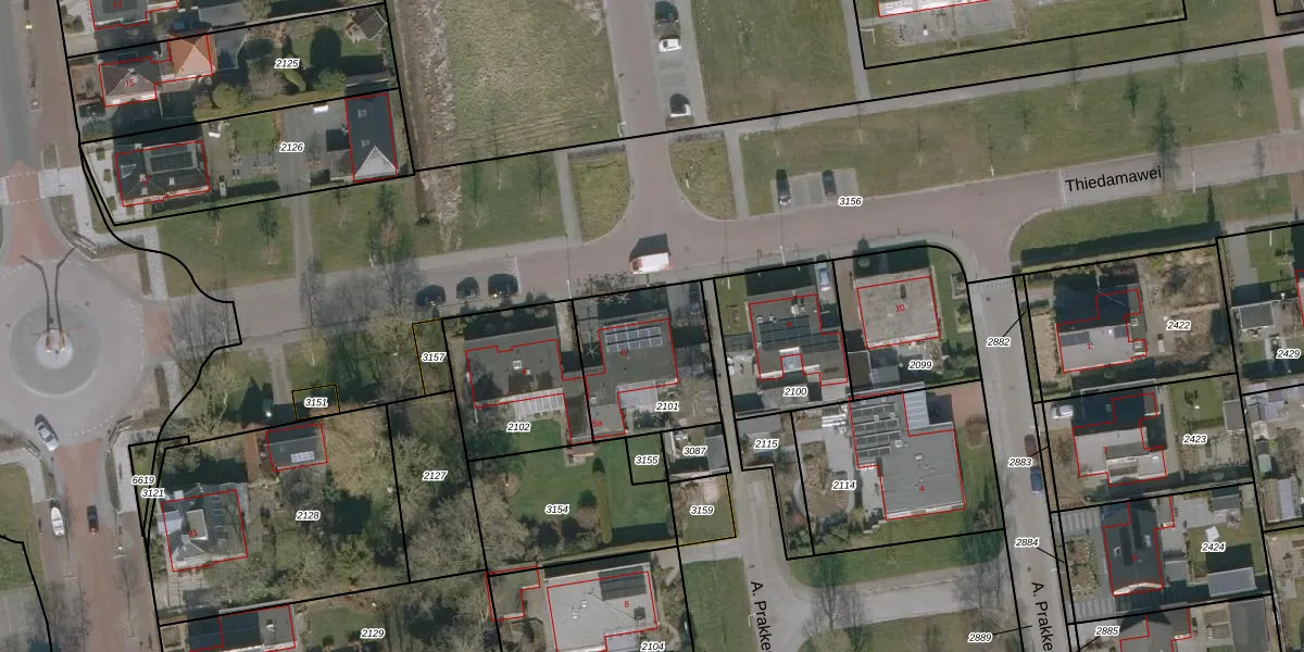 Het perceel waarop Thiedamawei 6 staat heeft een oppervlakte van 443 m². Dit is een groot perceel. De perceeloppervlakte wordt geregistreerd door het Kadaster. Gedetailleerde informatie over de maten van dit perceel kunt u vinden in het rapport Kadastrale kaart met maatvoering van Thiedamawei 6.