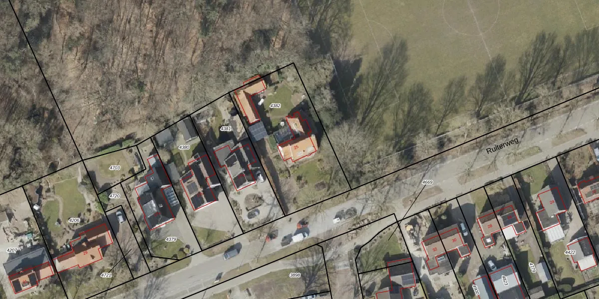 Ruiterweg 25 is gelegen op kadastraal perceel HVT03H4382. Deze kadastrale aanduiding is uniek en wordt gebruikt door het Kadaster om eigendomsrechten en andere zakelijke rechten vast te leggen. Het perceel maakt onderdeel uit van de kadastrale gemeente Havelte.