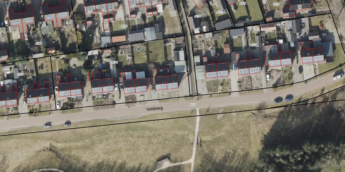Het perceel waarop Veldweg 15 staat heeft een oppervlakte van 2660 m². Dit is een zeer groot perceel. De perceeloppervlakte wordt geregistreerd door het Kadaster. Gedetailleerde informatie over de maten van dit perceel kunt u vinden in het rapport Kadastrale kaart met maatvoering van Veldweg 15.