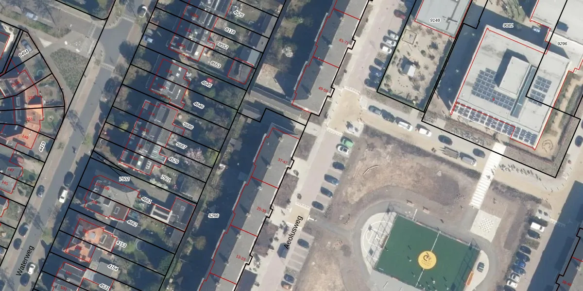 Het perceel waarop Aeolusweg 45 staat heeft een oppervlakte van 1989 m². Dit is een zeer groot perceel. De perceeloppervlakte wordt geregistreerd door het Kadaster. Gedetailleerde informatie over de maten van dit perceel kunt u vinden in het rapport Kadastrale kaart met maatvoering van Aeolusweg 45.