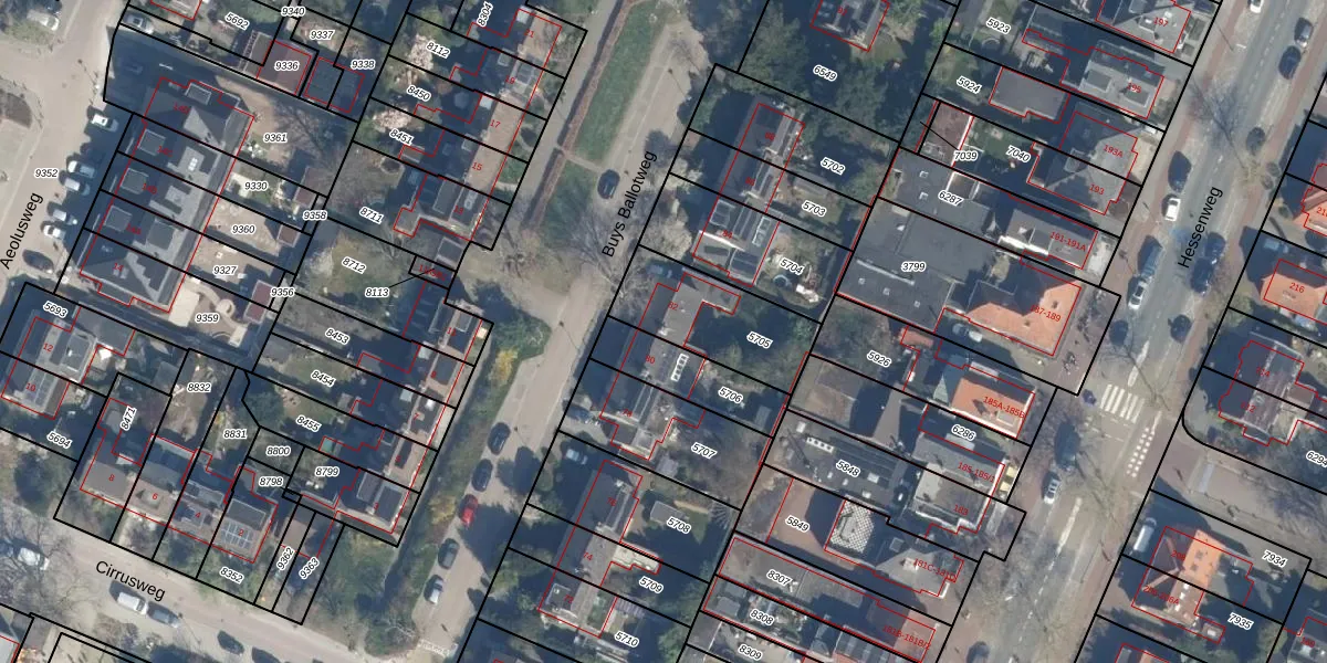 Het perceel waarop Buys Ballotweg 82 staat heeft een oppervlakte van 351 m². Dit is een groot perceel. De perceeloppervlakte wordt geregistreerd door het Kadaster. Gedetailleerde informatie over de maten van dit perceel kunt u vinden in het rapport Kadastrale kaart met maatvoering van Buys Ballotweg 82.