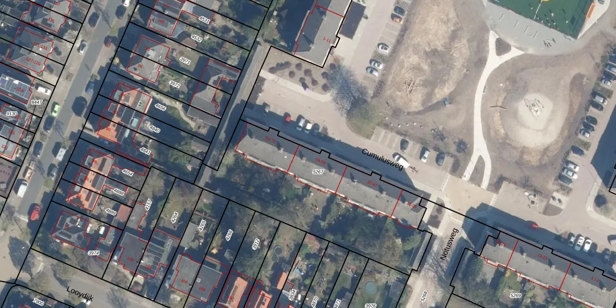 Het perceel waarop Cumulusweg 57 staat heeft een oppervlakte van 1811 m². Dit is een zeer groot perceel. De perceeloppervlakte wordt geregistreerd door het Kadaster. Gedetailleerde informatie over de maten van dit perceel kunt u vinden in het rapport Kadastrale kaart met maatvoering van Cumulusweg 57.