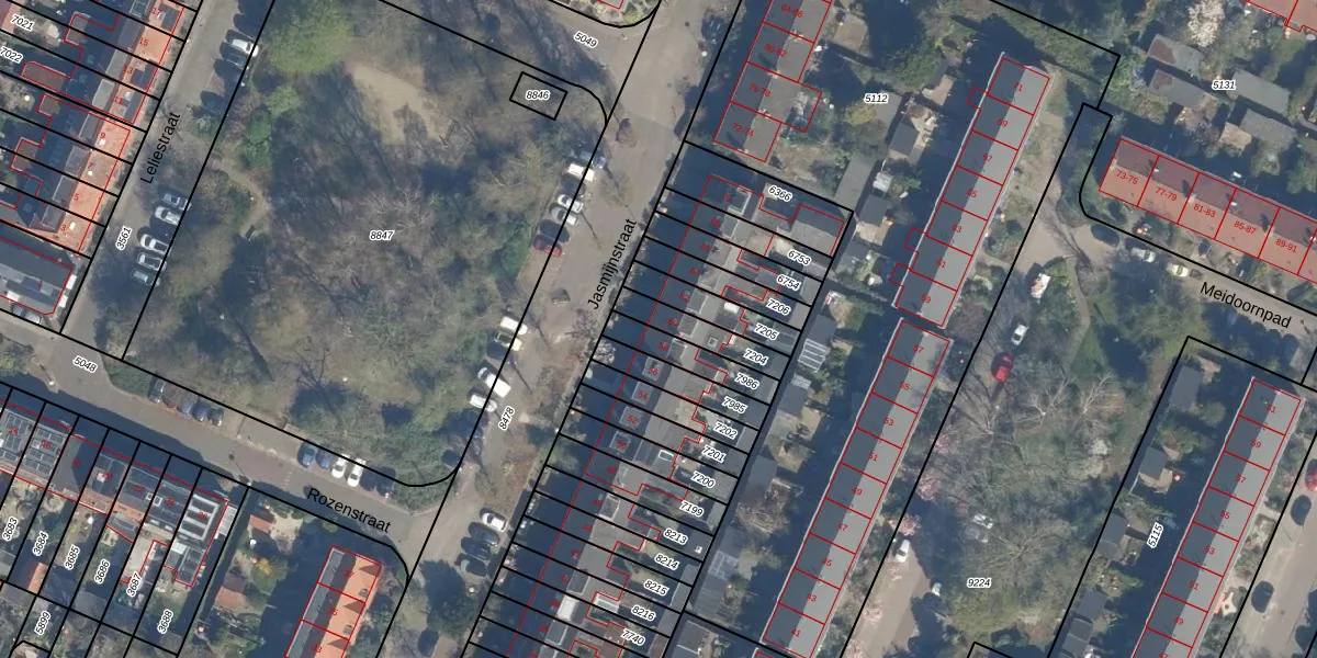 Het perceel waarop Jasmijnstraat 60 staat heeft een oppervlakte van 115 m². Dit is een middelgroot perceel. De perceeloppervlakte wordt geregistreerd door het Kadaster. Gedetailleerde informatie over de maten van dit perceel kunt u vinden in het rapport Kadastrale kaart met maatvoering van Jasmijnstraat 60.