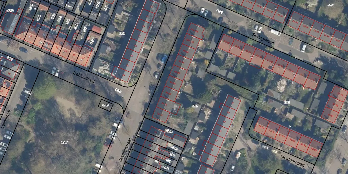 Het perceel waarop Jasmijnstraat 84 staat heeft een oppervlakte van 4312 m². Dit is een zeer groot perceel. De perceeloppervlakte wordt geregistreerd door het Kadaster. Gedetailleerde informatie over de maten van dit perceel kunt u vinden in het rapport Kadastrale kaart met maatvoering van Jasmijnstraat 84.