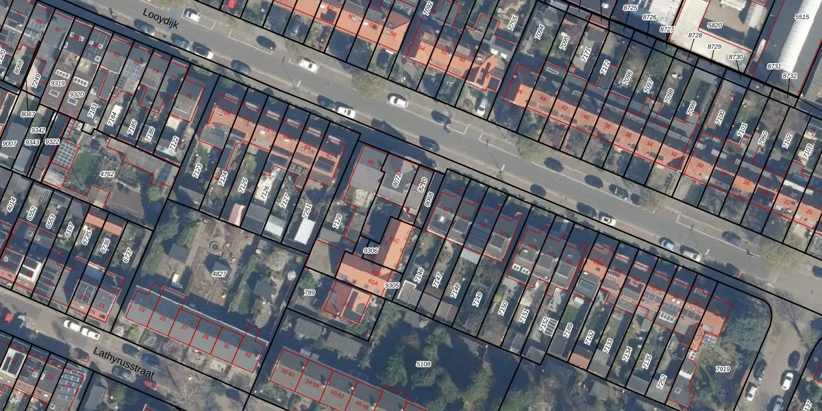 Het perceel waarop Looydijk 61 staat heeft een oppervlakte van 63 m². Dit is een klein perceel. De perceeloppervlakte wordt geregistreerd door het Kadaster. Gedetailleerde informatie over de maten van dit perceel kunt u vinden in het rapport Kadastrale kaart met maatvoering van Looydijk 61.