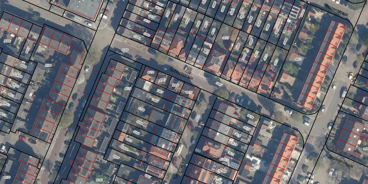 Het perceel waarop Schoolstraat 8 staat heeft een oppervlakte van 69 m². Dit is een klein perceel. De perceeloppervlakte wordt geregistreerd door het Kadaster. Gedetailleerde informatie over de maten van dit perceel kunt u vinden in het rapport Kadastrale kaart met maatvoering van Schoolstraat 8.