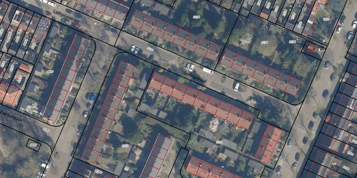Het perceel waarop Seringstraat 25 staat heeft een oppervlakte van 3278 m². Dit is een zeer groot perceel. De perceeloppervlakte wordt geregistreerd door het Kadaster. Gedetailleerde informatie over de maten van dit perceel kunt u vinden in het rapport Kadastrale kaart met maatvoering van Seringstraat 25.