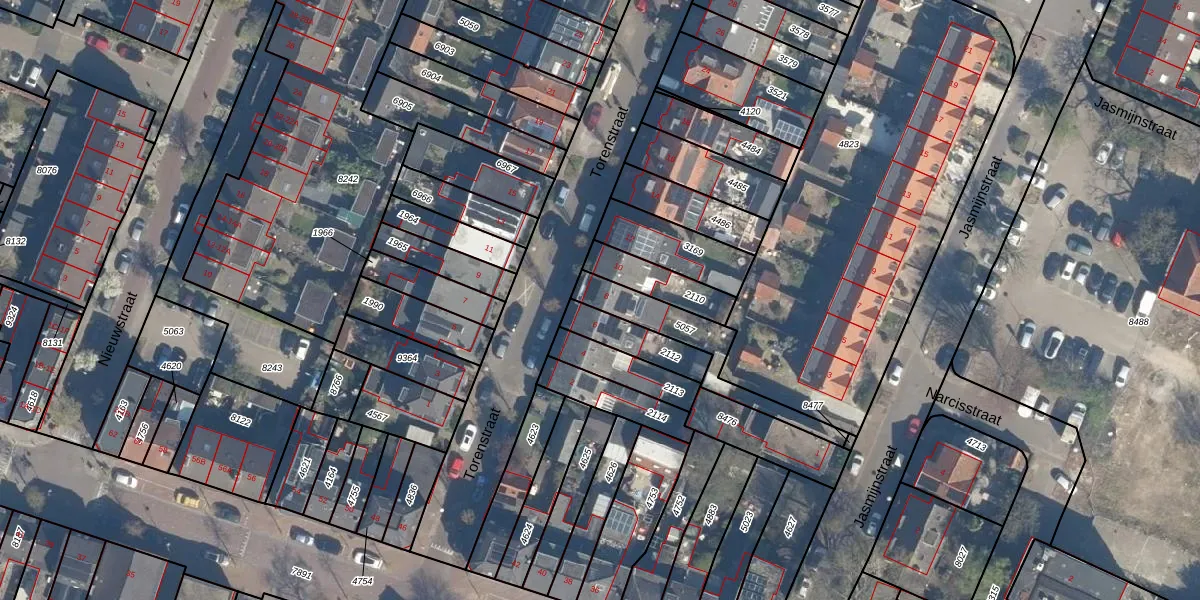 Gebruik de zoekbalk of klik op een perceel voor informatie over de adressen binnen dit perceel.