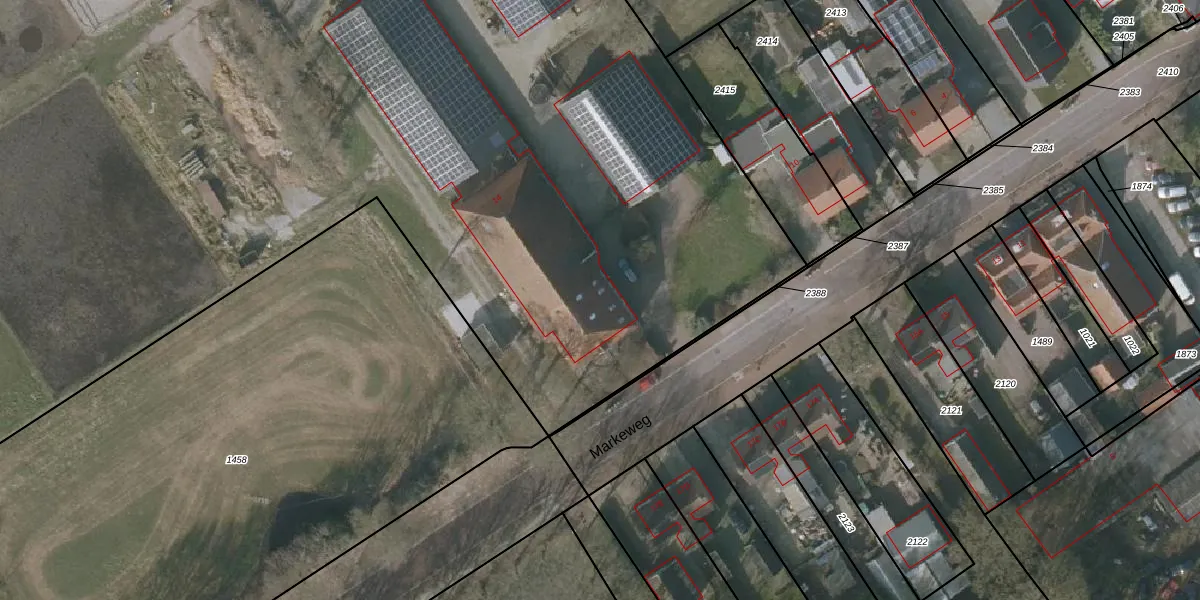 Het perceel waarop Markeweg 14 staat heeft een oppervlakte van 5,0 ha. Dit is een zeer groot perceel. De perceeloppervlakte wordt geregistreerd door het Kadaster. Gedetailleerde informatie over de maten van dit perceel kunt u vinden in het rapport Kadastrale kaart met maatvoering van Markeweg 14.