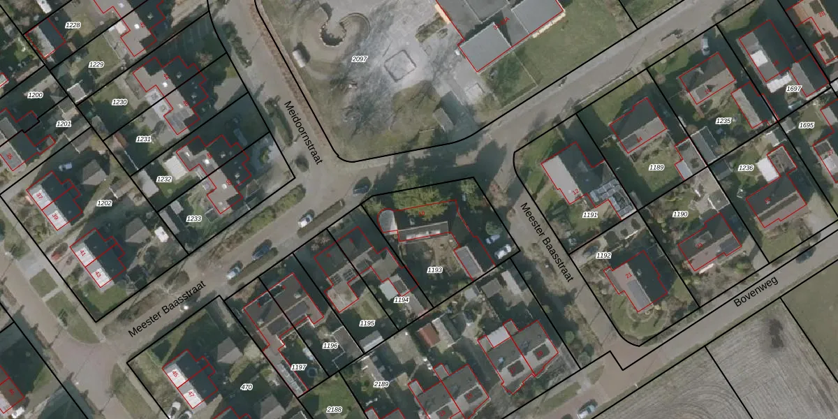 Het perceel waarop Meester Baasstraat 10 staat heeft een oppervlakte van 666 m². Dit is een groot perceel. De perceeloppervlakte wordt geregistreerd door het Kadaster. Gedetailleerde informatie over de maten van dit perceel kunt u vinden in het rapport Kadastrale kaart met maatvoering van Meester Baasstraat 10.