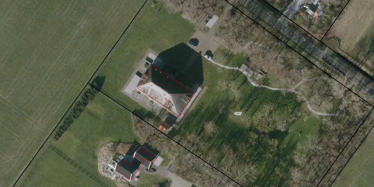 Het perceel waarop Hollandseweg 22 staat heeft een oppervlakte van 1,0 ha. Dit is een zeer groot perceel. De perceeloppervlakte wordt geregistreerd door het Kadaster. Gedetailleerde informatie over de maten van dit perceel kunt u vinden in het rapport Kadastrale kaart met maatvoering van Hollandseweg 22.