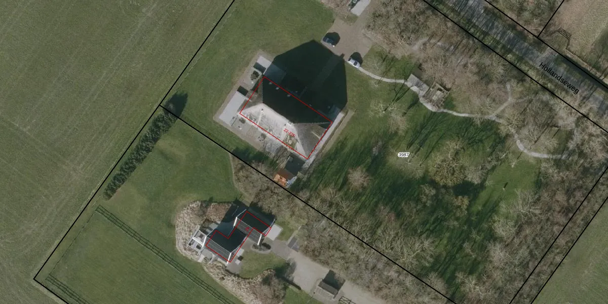 Het perceel waarop Hollandseweg 22-A staat heeft een oppervlakte van 1,0 ha. Dit is een zeer groot perceel. De perceeloppervlakte wordt geregistreerd door het Kadaster. Gedetailleerde informatie over de maten van dit perceel kunt u vinden in het rapport Kadastrale kaart met maatvoering van Hollandseweg 22-A.