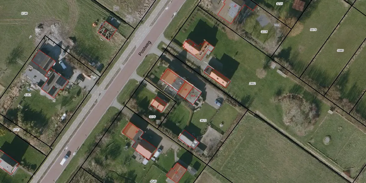 Het perceel waarop Postweg 56 staat heeft een oppervlakte van 1710 m². Dit is een zeer groot perceel. De perceeloppervlakte wordt geregistreerd door het Kadaster. Gedetailleerde informatie over de maten van dit perceel kunt u vinden in het rapport Kadastrale kaart met maatvoering van Postweg 56.