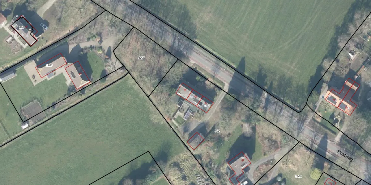 Het perceel waarop Postweg 45 staat heeft een oppervlakte van 2960 m². Dit is een zeer groot perceel. De perceeloppervlakte wordt geregistreerd door het Kadaster. Gedetailleerde informatie over de maten van dit perceel kunt u vinden in het rapport Kadastrale kaart met maatvoering van Postweg 45.