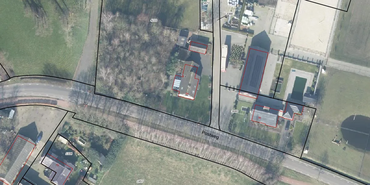 Het perceel waarop Postweg 54 staat heeft een oppervlakte van 4365 m². Dit is een zeer groot perceel. De perceeloppervlakte wordt geregistreerd door het Kadaster. Gedetailleerde informatie over de maten van dit perceel kunt u vinden in het rapport Kadastrale kaart met maatvoering van Postweg 54.