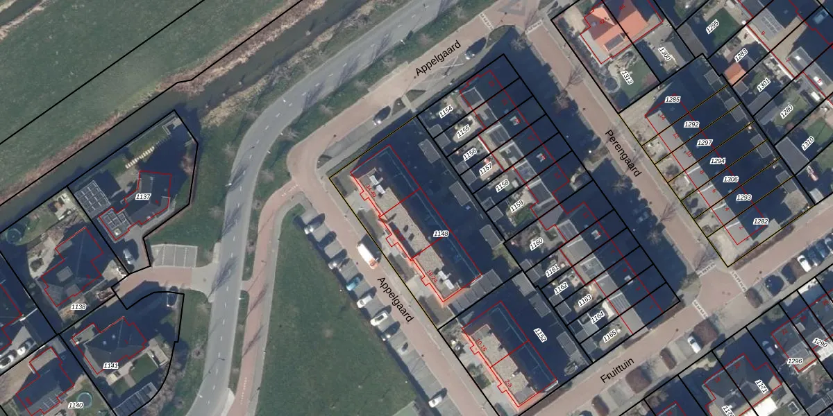 Het perceel waarop Appelgaard 30 staat heeft een oppervlakte van 1150 m². Dit is een zeer groot perceel. De perceeloppervlakte wordt geregistreerd door het Kadaster. Gedetailleerde informatie over de maten van dit perceel kunt u vinden in het rapport Kadastrale kaart met maatvoering van Appelgaard 30.