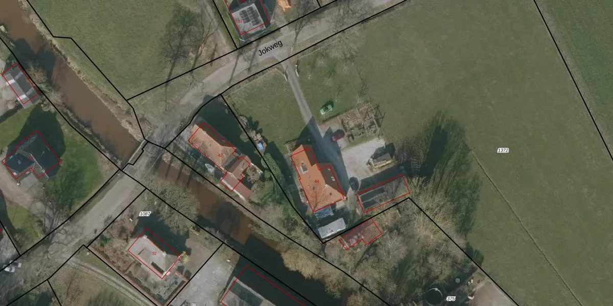 Jokweg 44 is gelegen op kadastraal perceel NWD02N1372. Deze kadastrale aanduiding is uniek en wordt gebruikt door het Kadaster om eigendomsrechten en andere zakelijke rechten vast te leggen. Het perceel maakt onderdeel uit van de kadastrale gemeente Noordwolde.