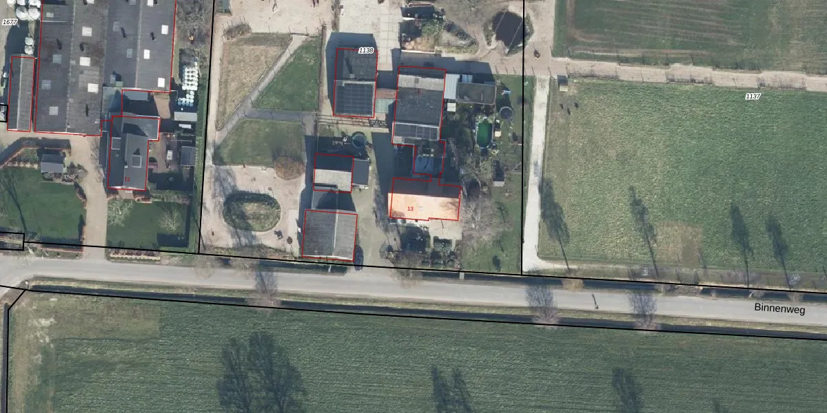 Binnenweg 13 is gelegen op kadastraal perceel EDE01M1138. Deze kadastrale aanduiding is uniek en wordt gebruikt door het Kadaster om eigendomsrechten en andere zakelijke rechten vast te leggen. Het perceel maakt onderdeel uit van de kadastrale gemeente Ede.