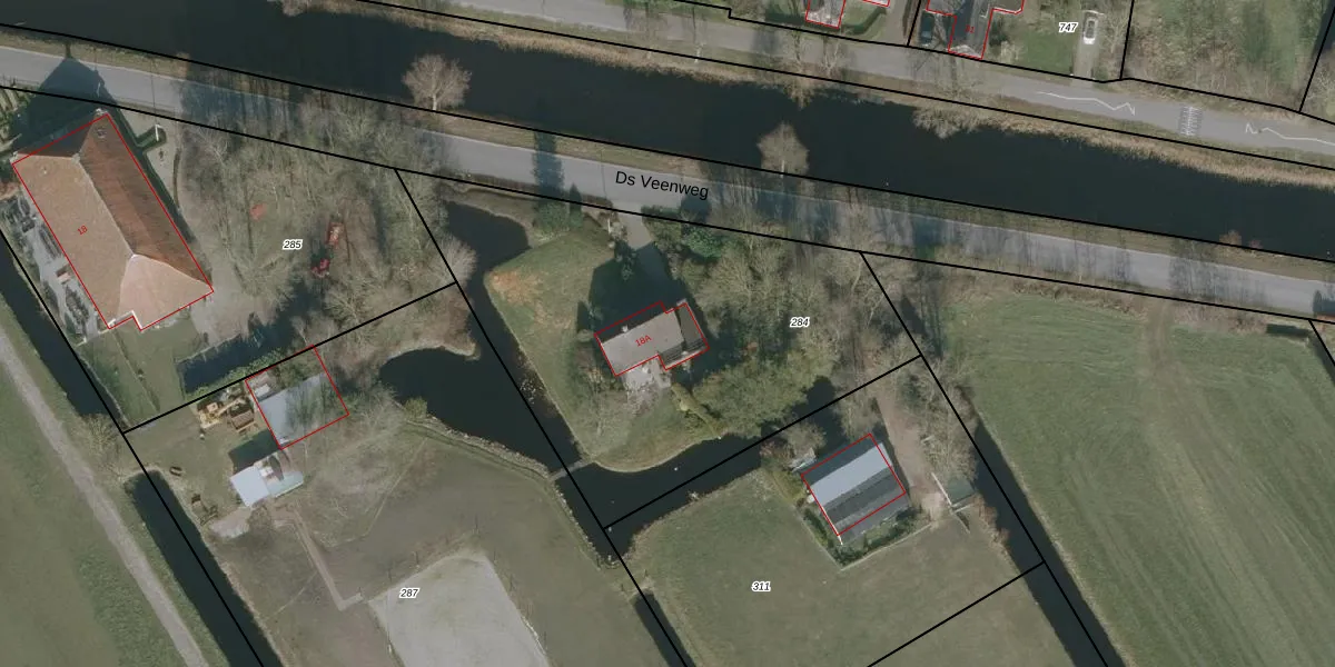 Het perceel waarop Ds Veenweg 18-A staat heeft een oppervlakte van 2165 m². Dit is een zeer groot perceel. De perceeloppervlakte wordt geregistreerd door het Kadaster. Gedetailleerde informatie over de maten van dit perceel kunt u vinden in het rapport Kadastrale kaart met maatvoering van Ds Veenweg 18-A.