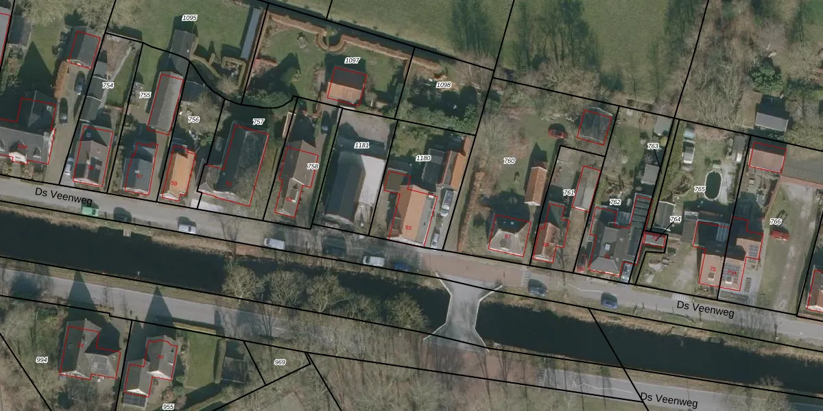 Ds Veenweg 65 is gelegen op kadastraal perceel KPE00F1180. Deze kadastrale aanduiding is uniek en wordt gebruikt door het Kadaster om eigendomsrechten en andere zakelijke rechten vast te leggen. Het perceel maakt onderdeel uit van de kadastrale gemeente Knijpe.