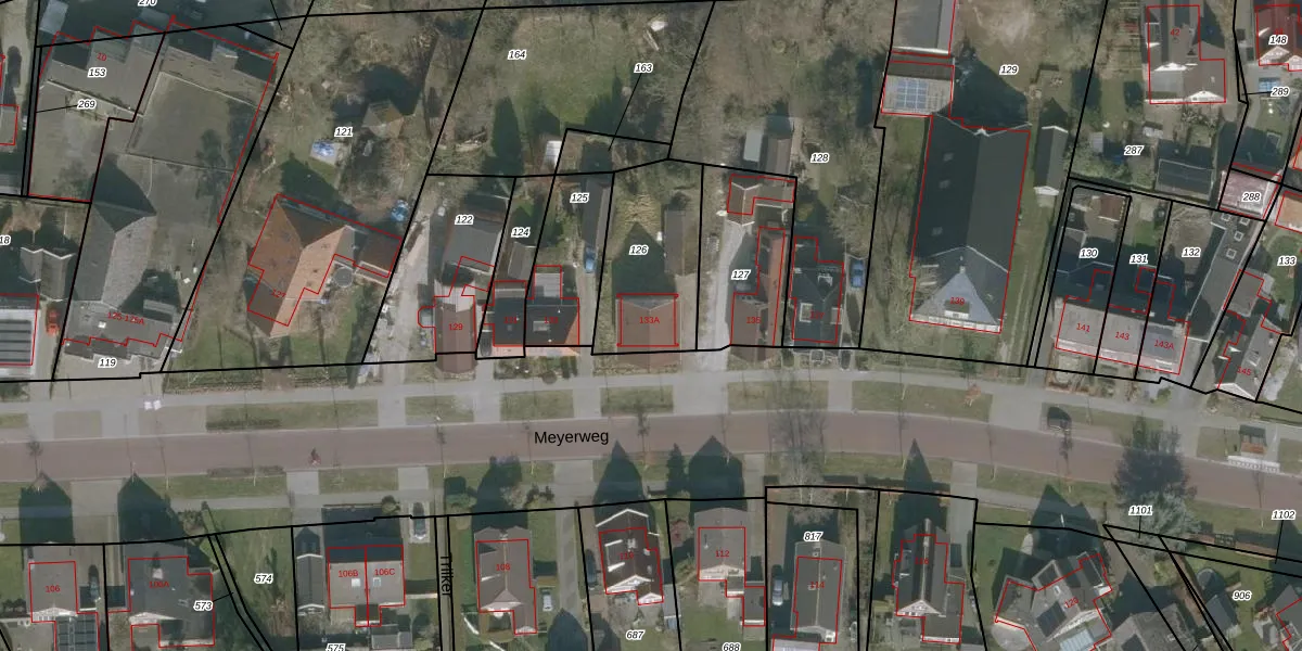 Het perceel waarop Meyerweg 133-A staat heeft een oppervlakte van 425 m². Dit is een groot perceel. De perceeloppervlakte wordt geregistreerd door het Kadaster. Gedetailleerde informatie over de maten van dit perceel kunt u vinden in het rapport Kadastrale kaart met maatvoering van Meyerweg 133-A.