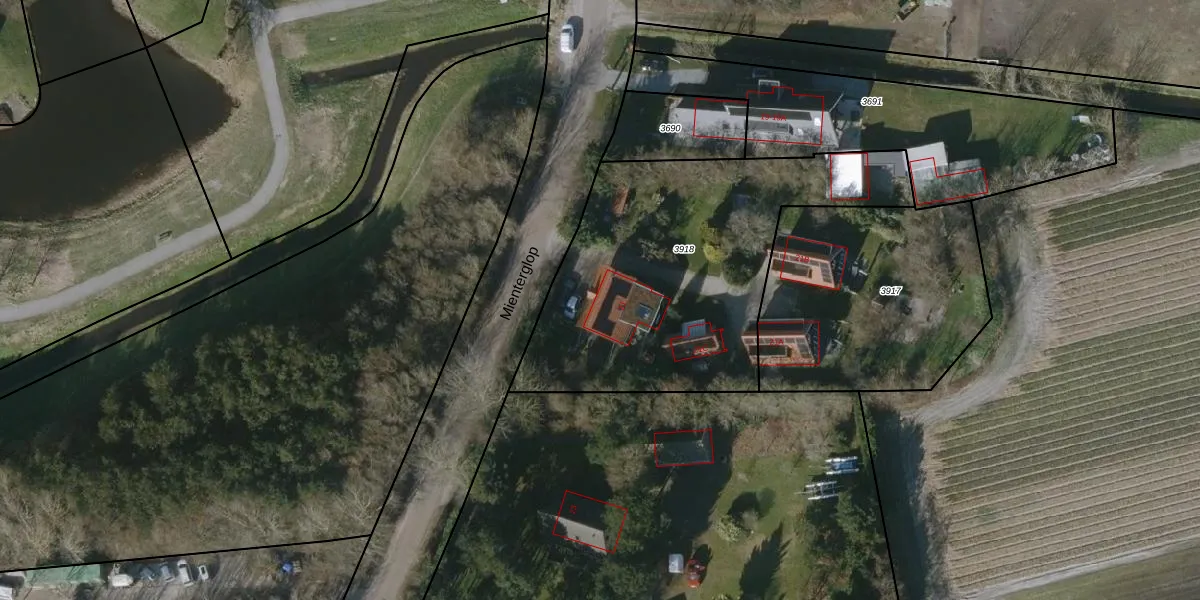 Het perceel waarop Mienterglop 21 staat heeft een oppervlakte van 1555 m². Dit is een zeer groot perceel. De perceeloppervlakte wordt geregistreerd door het Kadaster. Gedetailleerde informatie over de maten van dit perceel kunt u vinden in het rapport Kadastrale kaart met maatvoering van Mienterglop 21.