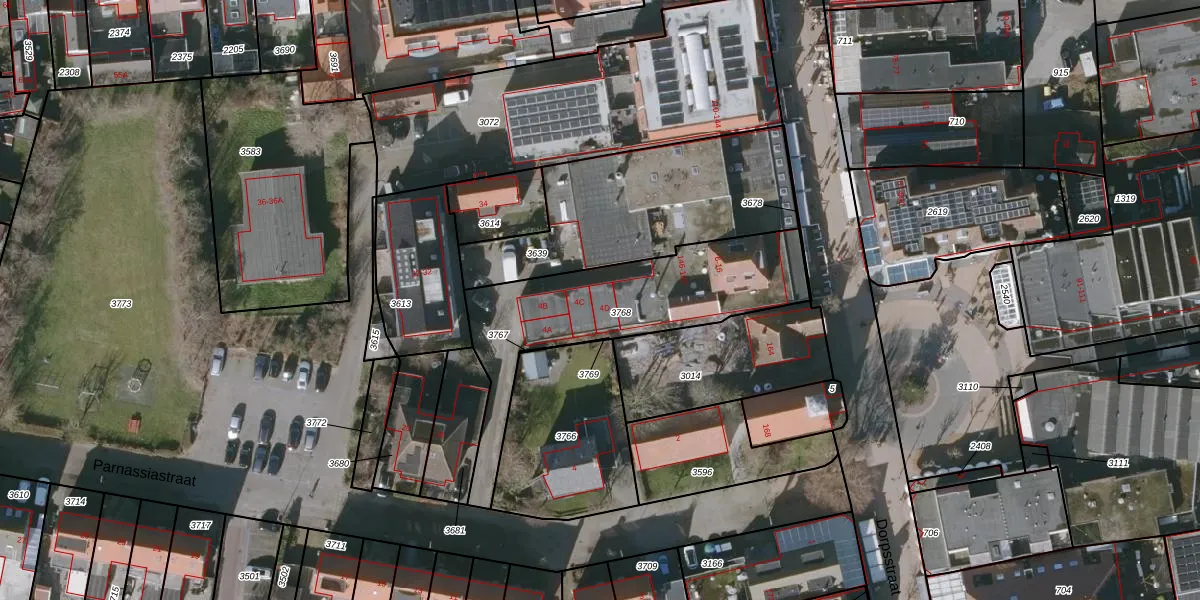 Het perceel waarop Parnassiastraat 4-D staat heeft een oppervlakte van 805 m². Dit is een groot perceel. De perceeloppervlakte wordt geregistreerd door het Kadaster. Gedetailleerde informatie over de maten van dit perceel kunt u vinden in het rapport Kadastrale kaart met maatvoering van Parnassiastraat 4-D.