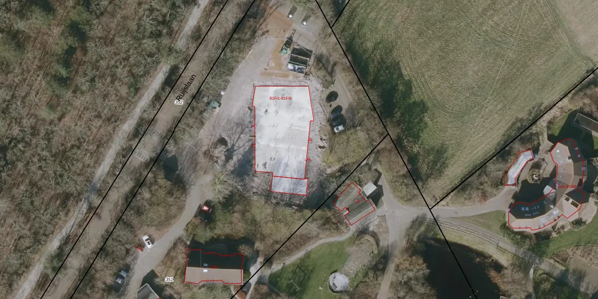 Het perceel waarop Ruijslaan 81-F-7 staat heeft een oppervlakte van 8330 m². Dit is een zeer groot perceel. De perceeloppervlakte wordt geregistreerd door het Kadaster. Gedetailleerde informatie over de maten van dit perceel kunt u vinden in het rapport Kadastrale kaart met maatvoering van Ruijslaan 81-F-7.