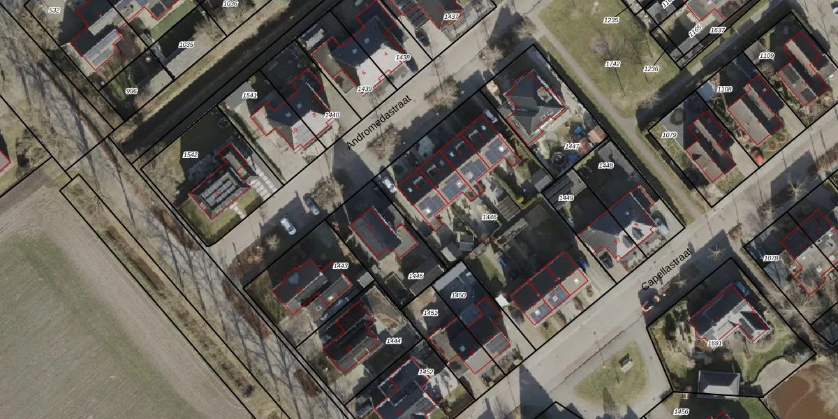 Het perceel waarop Andromedastraat 9 staat heeft een oppervlakte van 1651 m². Dit is een zeer groot perceel. De perceeloppervlakte wordt geregistreerd door het Kadaster. Gedetailleerde informatie over de maten van dit perceel kunt u vinden in het rapport Kadastrale kaart met maatvoering van Andromedastraat 9.