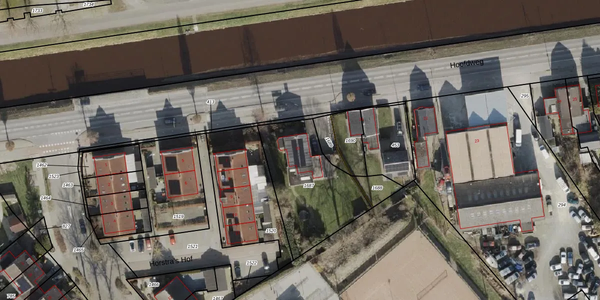 Het perceel waarop Hoofdweg 20 staat heeft een oppervlakte van 955 m². Dit is een groot perceel. De perceeloppervlakte wordt geregistreerd door het Kadaster. Gedetailleerde informatie over de maten van dit perceel kunt u vinden in het rapport Kadastrale kaart met maatvoering van Hoofdweg 20.