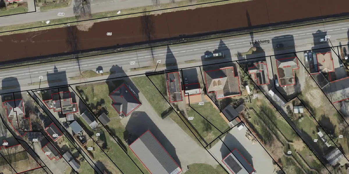Het perceel waarop Hoofdweg 82 staat heeft een oppervlakte van 630 m². Dit is een groot perceel. De perceeloppervlakte wordt geregistreerd door het Kadaster. Gedetailleerde informatie over de maten van dit perceel kunt u vinden in het rapport Kadastrale kaart met maatvoering van Hoofdweg 82.