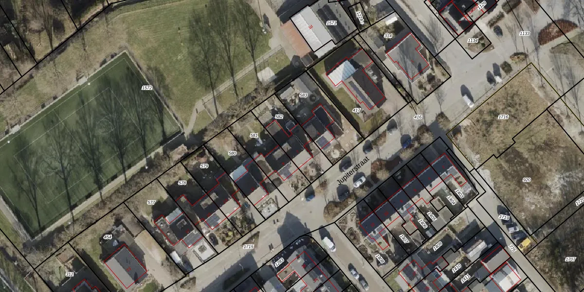 Het perceel waarop Jupiterstraat 7 staat heeft een oppervlakte van 318 m². Dit is een groot perceel. De perceeloppervlakte wordt geregistreerd door het Kadaster. Gedetailleerde informatie over de maten van dit perceel kunt u vinden in het rapport Kadastrale kaart met maatvoering van Jupiterstraat 7.